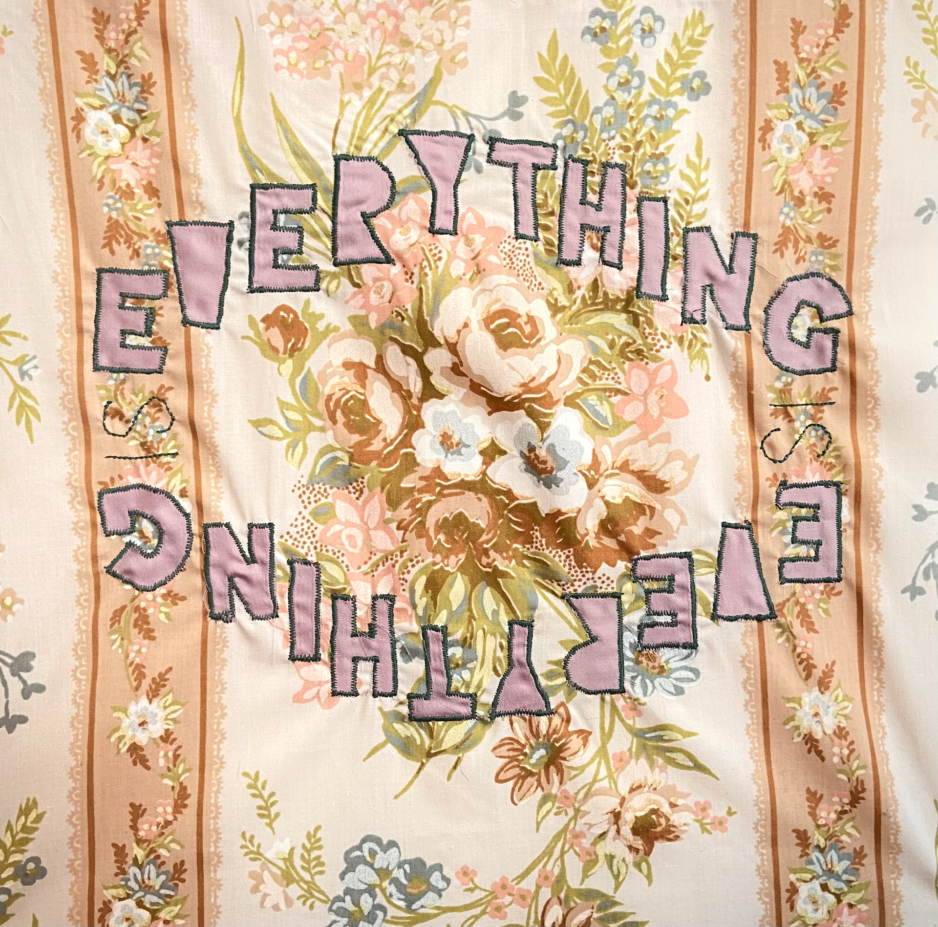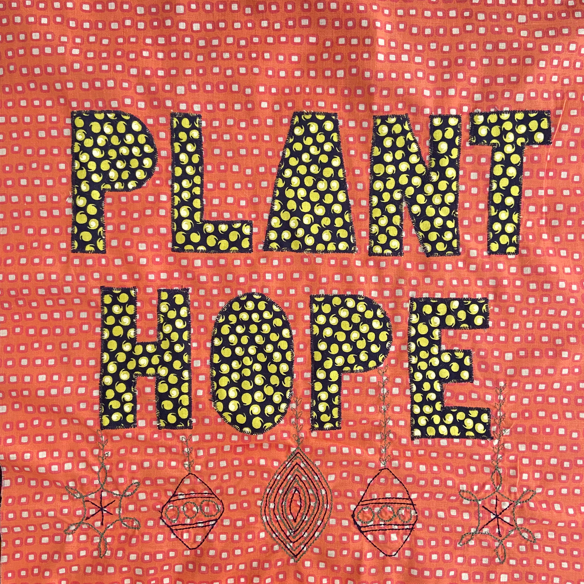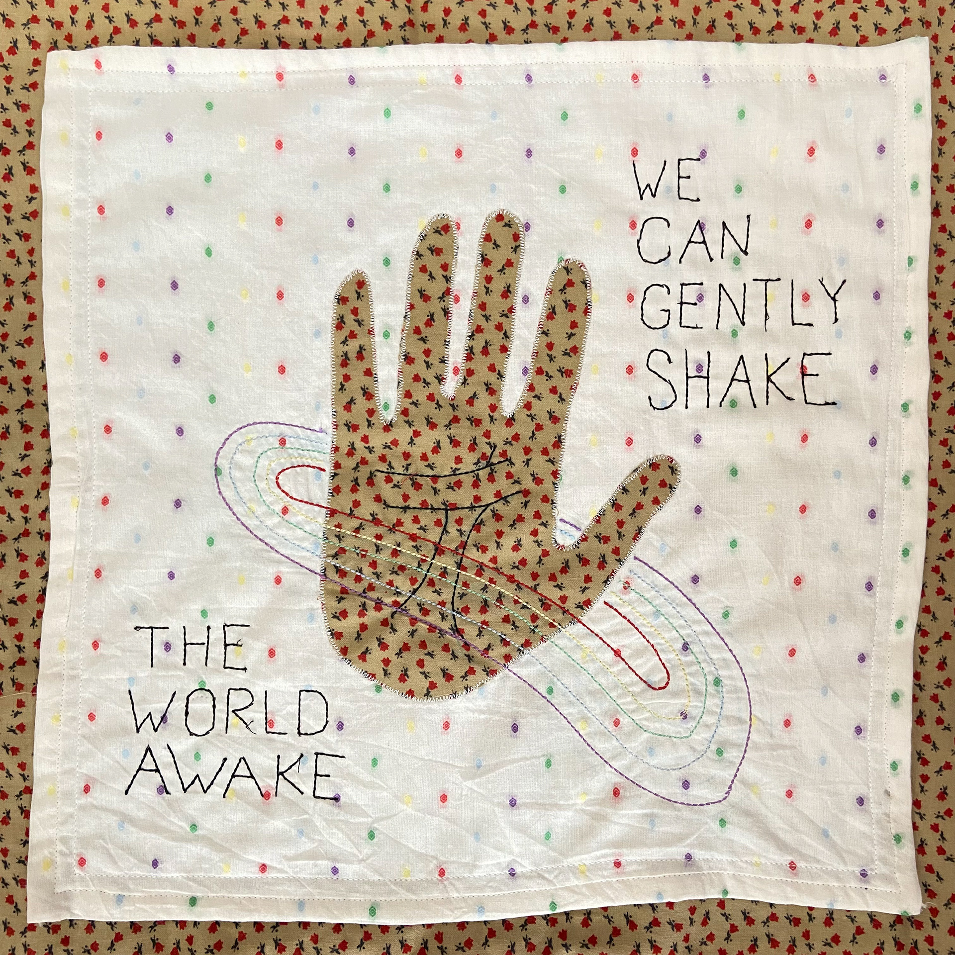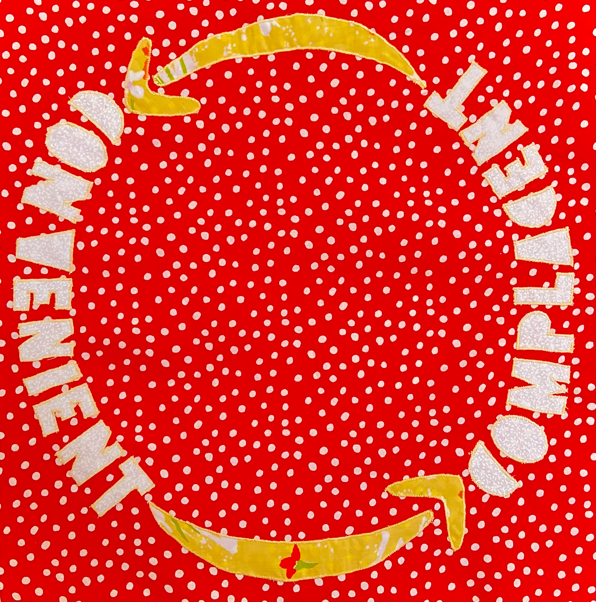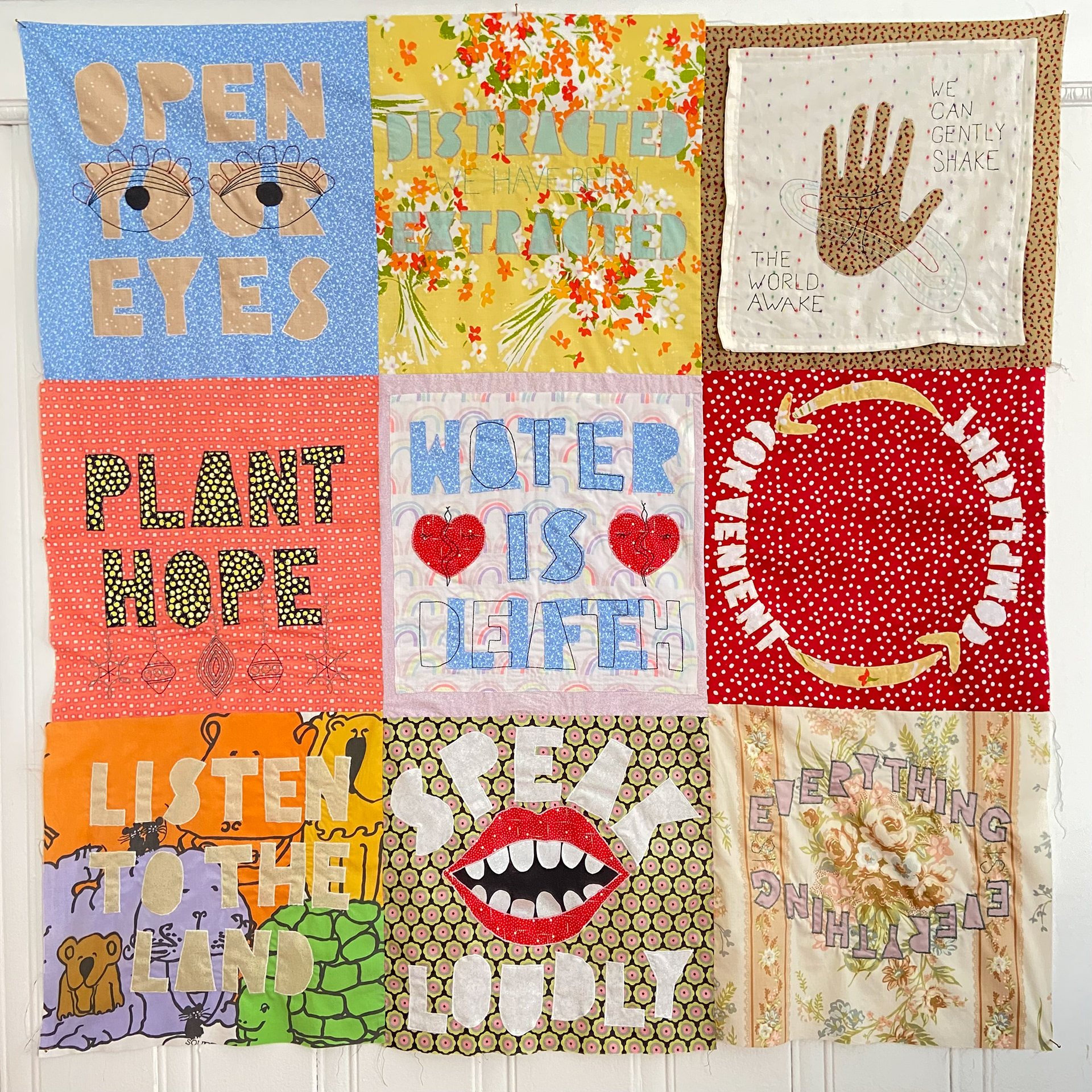 Cotton and poly-blend fabric remnants, polyester thread 45 in. x 45 in. Created in 2021 for an Eco Art Matters course at Laney College and featured in the 2023 exhibition 'Support Systems' at Side Bitch Gallery in L.A.