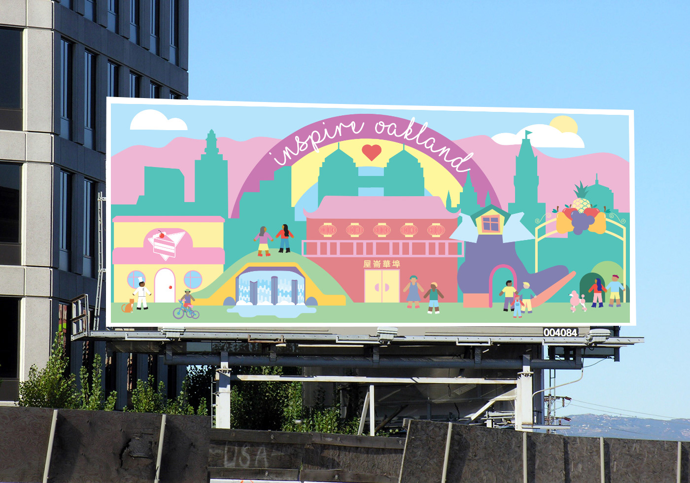 Winning submission for the 2018 'Inspire Oakland' billboard competition featuring some of the various neighborhoods and communities that make up the vibrant city of Oakland.