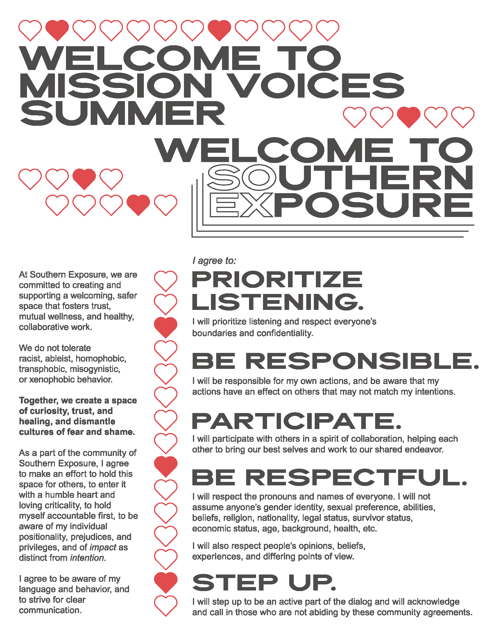 Three classroom poster designs for Southern Exposure's Mission Voices Summer program
